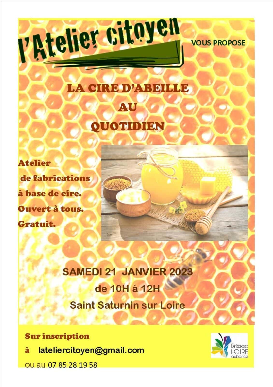 Gratuit sur inscription salle du réfectoire au Mont rude à St Saturnin ( route descendant à gauche derrière l’église). Nous réaliserons 4 recettes autour de la cire: de l’encaustique, du cirage pour les cuirs, du baume à lèvres et pour les mains et des Beewraps ( films alimentaires) Nous nous occupons d’apporter le matériel et l’Atelier Citoyen prendra en charge l’achat des ingrédients. Vous pourrez cependant apporter: Tablier, 2 pots de confiture et 1 ou 2 petits pots en verre avec couvercle, quelques jolis morceaux de tissu en coton ( nous en aurons aussi quelques uns). CONTACT : Clara Jolivet 07 85 28 19 58 L’Atelier citoyen, c’est aussi une page Facebook : l’Atelier citoyen 49 Pensez à partager la page dans vos réseaux Si vous voulez recevoir les informations, les invitations ou adhérer à l’Atelier citoyen, laissez-nous un message à lateliercitoyen@gmail.com