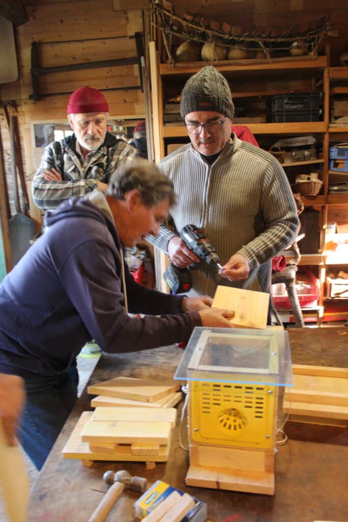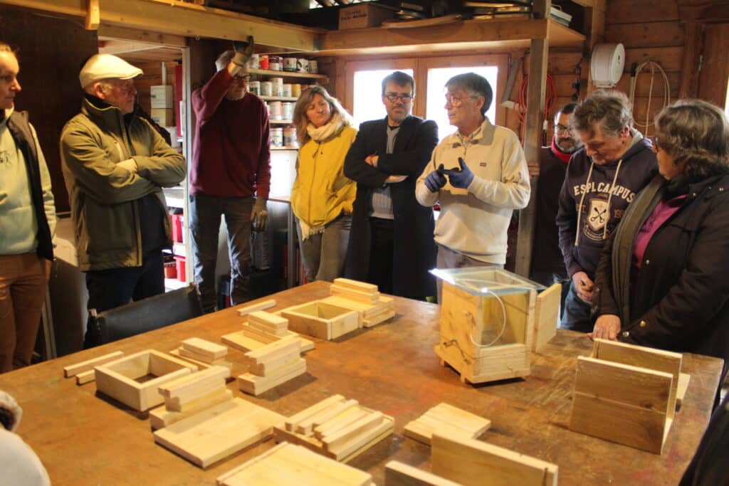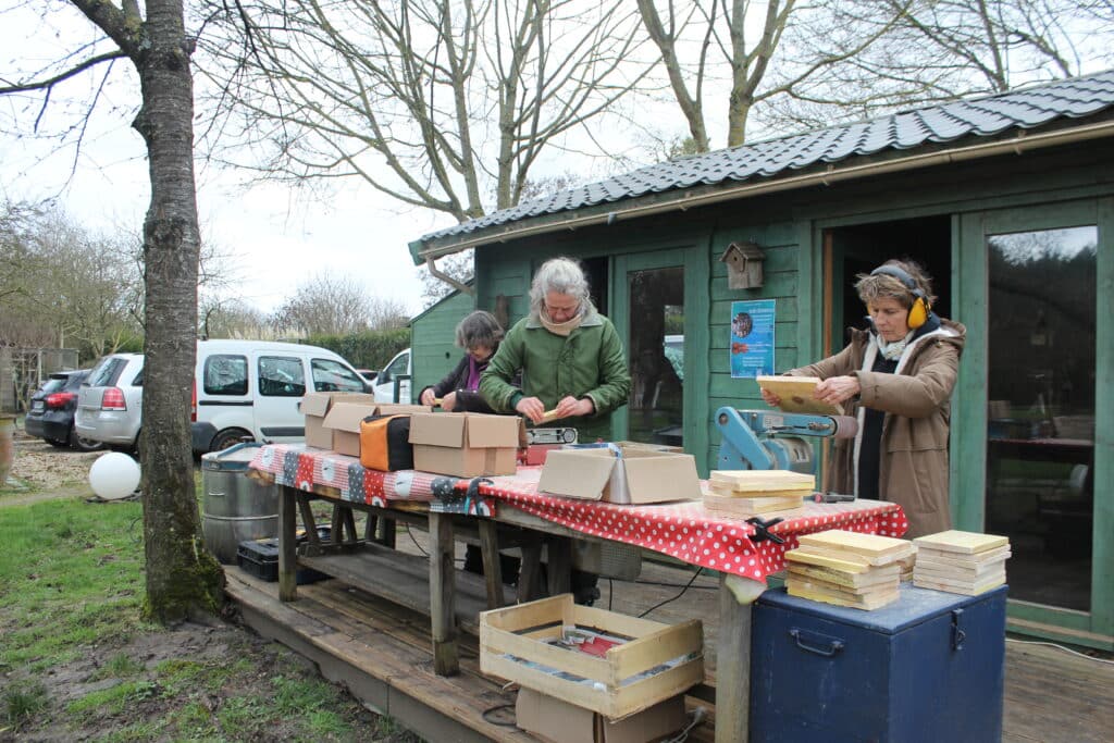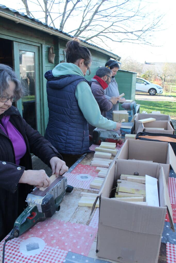 Ce jour ci, l’objectif était de construire une quarantaine de pièges à frelons en bois, modèle homologué dans le plan national de piégeage.