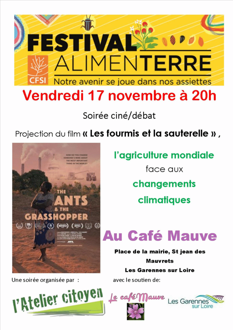 2 invités animeront le débat qui suivra la projection du film « LES FOURMIS ET LA SAUTERELLE » – Olivier Hauville est cofondateur de « Echoppe » (Echange pour l’Organisation et la Promotion des Petits Entrepreneurs) ; expert en économie solidaire, il agit depuis plus de 30 ans contre la pauvreté et pour le Développement. Il est engagé auprès des acteurs au Togo (femmes, restauratrices de rue, petits paysans) mais aussi en France (en Anjou) pour soutenir une agriculture plus équitable et durable. https://www.echoppe.org – Etienne Supplisson apportera un éclairage sur les enjeux pour l’agriculture en Pays de Loire avec le scénario Virage-Energie-Climat à partir de la méthode Afterres 2050 – Solagro. https://afterres2050.solagro. org Un petit buffet sera offert par l’atelier citoyen à l’issue de la soirée. Samedi 18 novembre à 15H00 au café Mauve : atelier « Inventons nos vies bas carbone »
