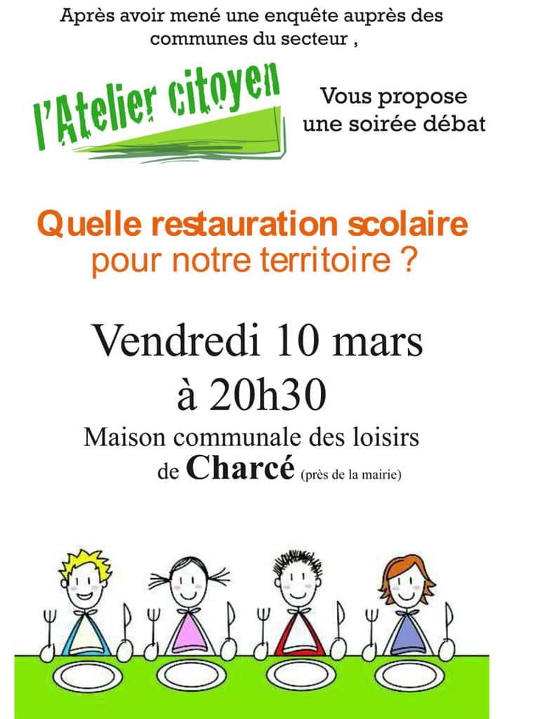 L’Atelier citoyen a conduit durant l’année 2016 une enquête auprès de quelques restaurations scolaires de la région de Brissac Cette action permet de faire le constat d’une diversité et d’une richesse des choix d’organisation et de gestion de la restauration scolaire par les collectivités. Au-delà du constat, il est important d’ échanger sur l’avenir de ce service d’intérêt collectif , à une époque où l’agriculture est face à des choix vitaux et où le consommateur, le citoyen, le contribuable est interrogé sur la place qu’il prend – ou pas – dans ces choix qui engagent l’avenir sur le plan de la santé, du vivre ensemble, de la vitalité économique de nos territoires. La restauration scolaire que l’on propose à nos enfants est un concentré, à petite échelle, de tous ces enjeux. C’est d’autant plus vrai actuellement dans le contexte de réorganisation territoriales des collectivités locales : quelle marge de manœuvre pour les communes déléguées dans leurs choix futurs ? Une première réunion s’est tenue le 19 janvier , à destination des élus et des représentants du GABB Anjou, de la Chambre d’Agriculture, de la plateforme de distribution Bio Loire Océan. Pour prolonger ce débat, l’Atelier citoyen vous propose une soirée de présentation publique des résultats et d’échanges sur le thème : Quelle restauration scolaire pour nos communes demain ? Plaquette-V4-pages Tlcharger l’tude de la diversit des solutions mises en Suvre. Articles de Presse suite à la soirée